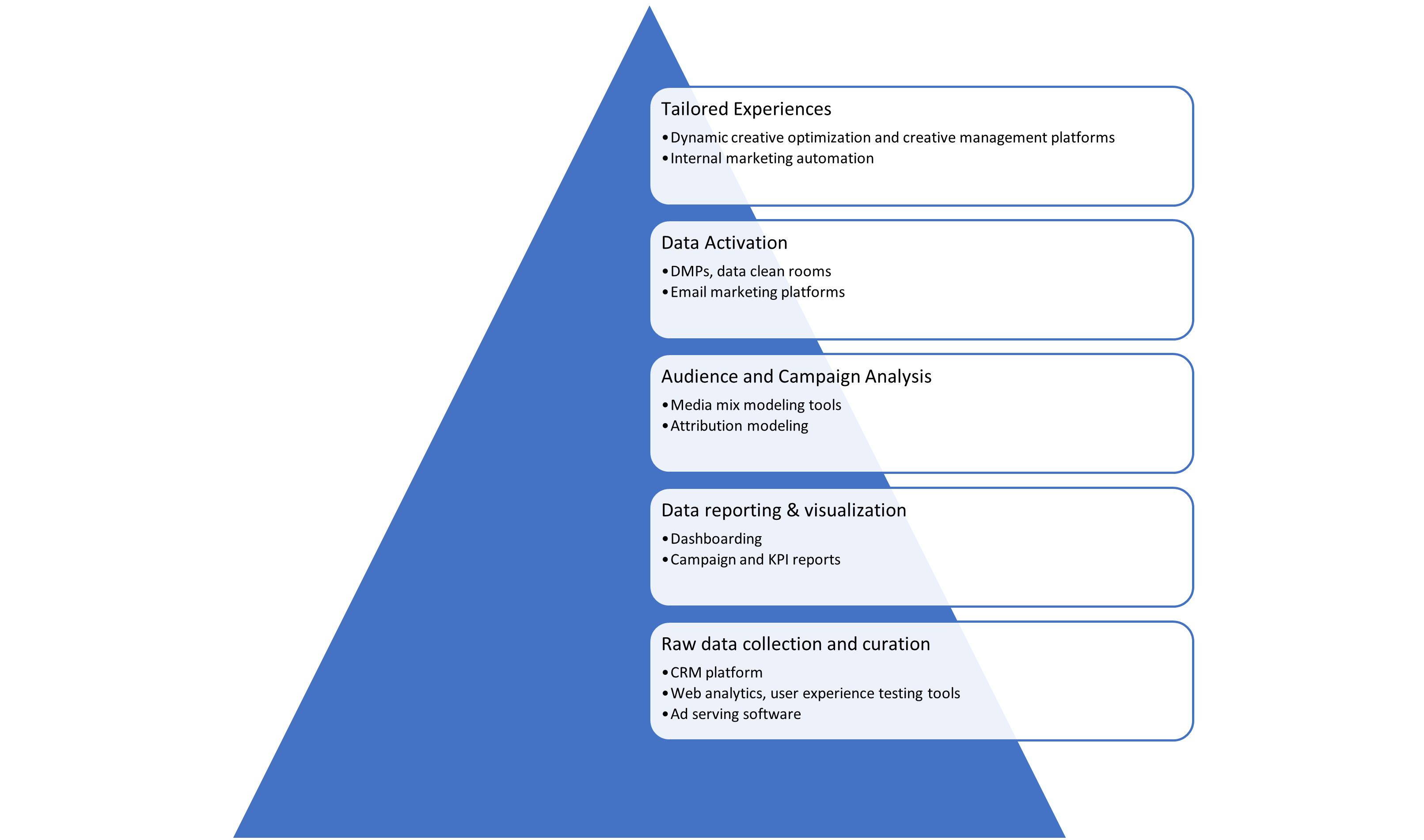 Without sounding like a truism, data is the backbone of any data-driven marketing initiative. As such, implementing an accurate and trusted data collection regime is the foundation to any attempt at a tech stack hierarchy. While we often think of the CRM as the core of this layer, there are other crucial pieces such as web analytics and ad servers that play an important role in generating the raw data that will be used down the road.