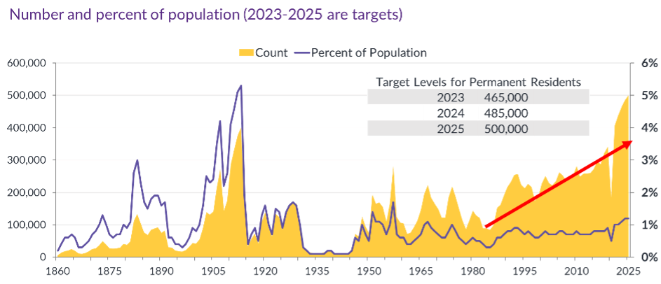 The rate of permanent resident immigration is likely to remain high. By 2025, Canada will welcome the largest number of permanent residents since the early 1900s. This upswing is set to reinforce Canada's image as a welcoming hub for immigrants seeking a fresh start. While there is a cloud of uncertainty looming over the future of temporary immigration, it is probable that it will be scaled down from the levels it was at during 2022 and 2023.