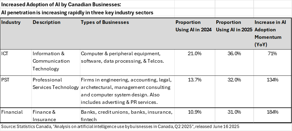 [5] Statistics Canada, Analysis on Artificial Intelligence Use by Businesses in Canada, Q2 2025, released June 16, 2025.